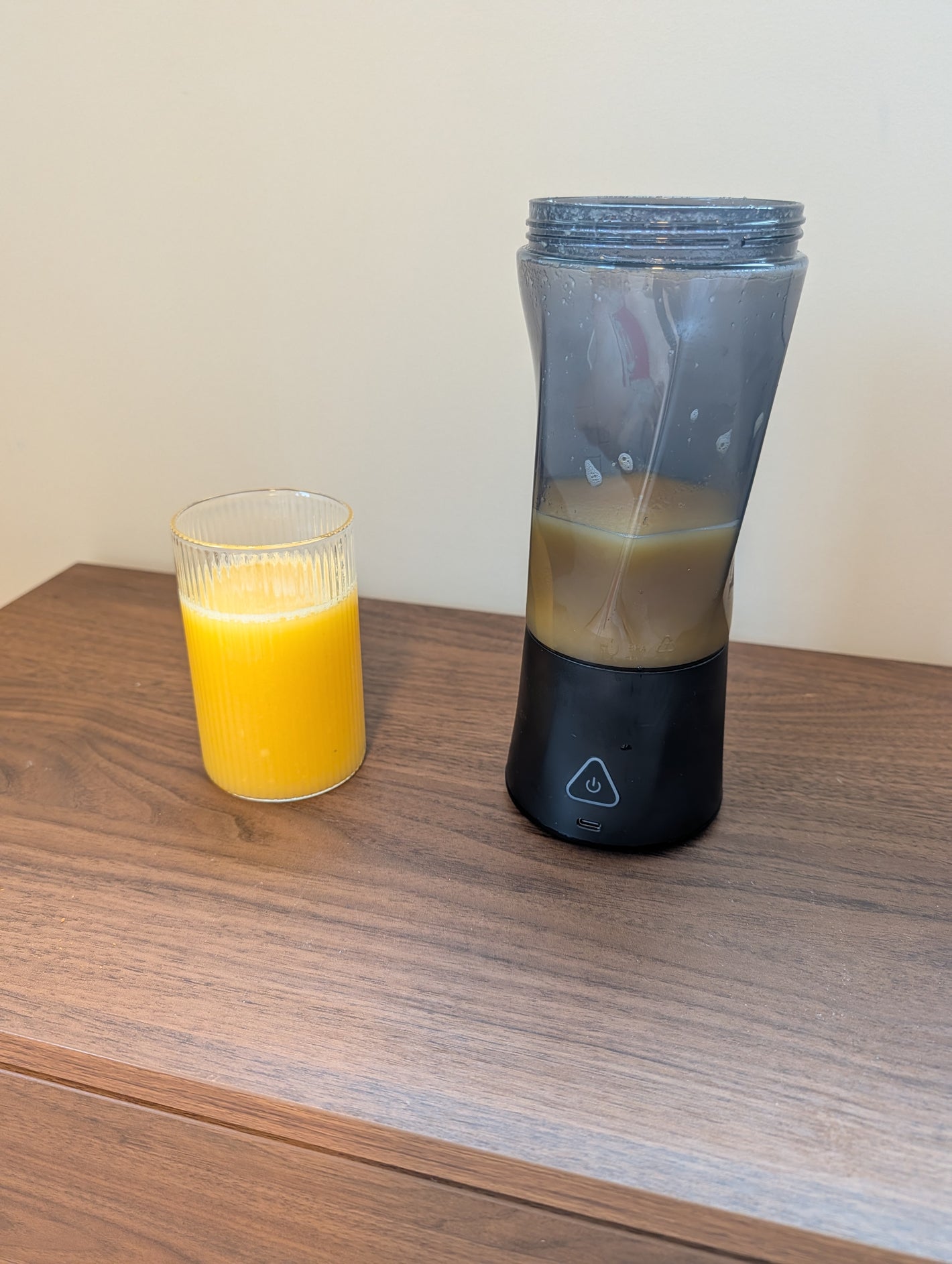 6000 mAh-batteriet gir rundt 15–20 blandinger per lading, avhengig av hva du lager. Det lades helt opp på omtrent 4 timer med den inkluderte USB-C-kabelen.